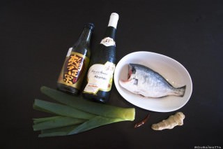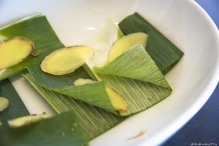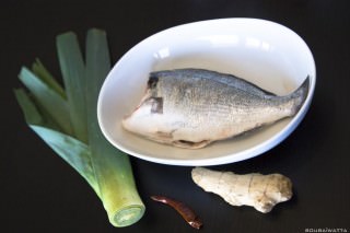 2 – Couper une feuille de poireaux en grand rectangle et un bout du tubercule de gingembre en très fines tranches. Placer ces deux ingrédients au fond du plat devant recueillir le poisson afin que le poisson puisse absorber ces saveurs pendant sa cuisson. Ajouter une cuillère à café de vin blanc sur le poisson.