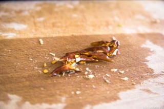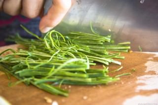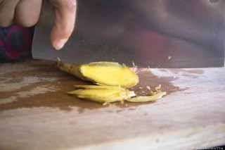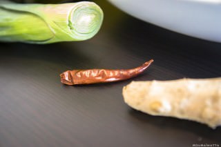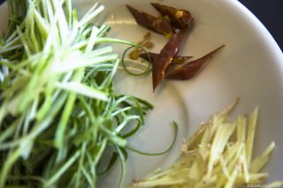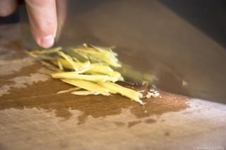 3 – Pendant que le poisson cuit, couper le reste du gingembre en très fines lames, ainsi qu’une seconde feuille de poireaux également en fines lames et le piment en petits morceaux.