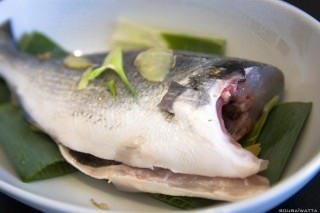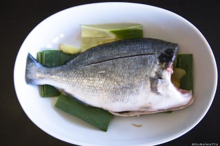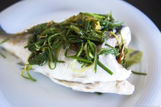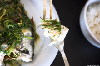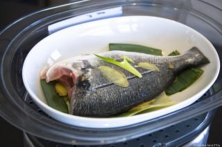 5 – On sort le poisson du cuiseur vapeur pour le placer dans son plat final, sans les feuilles de poireaux et le gingembre qui se trouvaient dessous, et sans le « jus » qu’il si trouve.
