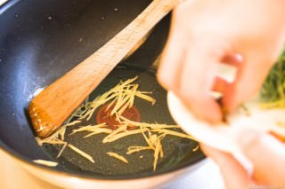 4 – Faire sauter le gingembre et le piment dans un wok ou une poile jusqu’à ce que vous sentez l’odeur du gingembre arriver a vos narines. Puis on ajoute les fines lames de poireaux juste quelques secondes, le temps de les saisir ( vous allez voir la couleur changer ) et on ajoute tout de suite une cuillère à soupe de sauce de soja ainsi que deux cuillères à soupe d’eau.