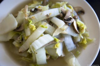 On sert ensuite le poisson avec un bol de riz nature qui peu être accompagne d’un petit plat de légumes comme ici feuilles de choux chinois, champignons et ail sautés au wok ou à la poile.